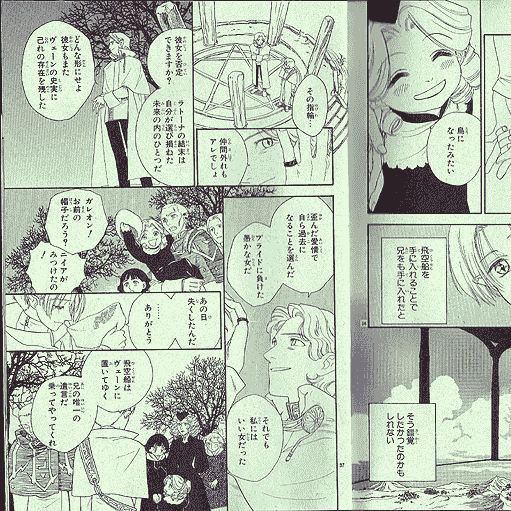 Note: The following is a translation of what was once a section of Vheen Hikuusen Monogatari mangaka Akari Funato's webpage, Himawari Lamp. The pages translated have, unfortunately, been taken down; I was lucky enough to have saved the accompanying illustrations on my hard drive, though, and have posted the pictures here. The pics are actually pages from the original version of "Kokuhaku Suru Kioku" printed in the Asuka DX manga magazine. As explained below, Funato posted them to show her readers a sampling of the differences between the magazine version of "Kokuhaku Suru Kioku" and the later tankoubon compilation (over which she had more control). The differences are noted in the descriptions. Page 1 LUNAR