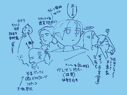 ![]() [Above is a li'l rough (rough) sketch of the back cover pic of the cast. Tagak, man of many trades and skills. Sheetmetalworker, artisan. Unsociable. Rouj, old scholar (hence his name). Child of the old city, born and raised. Chikao Ohtsuka [she means the seiyuu she had in mind for Rouj. Ohtsuka's had tons of roles, but not anything I think instantly recognizable to Westerners; he has done Dr. Eggman tons of times, it seems]. [A scribble between Rouj and Tagak notes that they are parent and child.] Morris, premier of Vheen. Has a sly, Takeshi Kaga voice. [I presume everyone knows who Mr. Allez Cuisine is.]