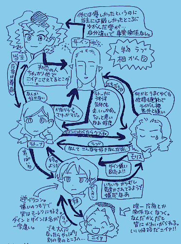 ![]() [A "character love relationship chart" is next, drawn in the same scribbly style as the previous pic. I tried and tried to modify this chart so as to replace the Japanese text with English text, but my image editing program keeps screwing the image up after I add the text, so I've just added the translated text (which keeps slipping from first to third person and back again) below.] Zain -> Guildmistress: Though he was gentle with others, he was at times very harsh to her. It was a sort of twisted love... The personal accounts differ, and not all the facts are known. Guildmistress -> Latona: I respect the magic race. Latona -> Guildmistress: Vague dislike. Zain -> Latona: Vaguely senses Latona's feelings, but kind of goes "oh, well" at them - not anything beyond "hmmm, this may be a little bit of a problem". Latona -> Zain: Quite in love with him. Meaning, she's serious. Zain -> Morris: Friend [li'l heart!]. Morris -> Zain: We get along quite well, for some reason - particularly seeing how our personalities are different! Sees Zain as a rival - hates him to a surprising degree. [Switching from Morris's voice to Funato's.] Latona -> Morris: He can't hold a candle to Zain! Morris -> Latona: Love. Why do I have to fall for women like her... Latona -> Ghaleon: Like a little brother! Ghaleon -> Latona: Like a big sister. Morris -> Ghaleon: He hates Zain, just like me!! Ghaleon -> Morris: He's always giving me a hard time, and it's like he reads my mind. I hate him! Ghaleon -> Niea: Like a little sister. Niea -> Ghaleon: Love. (But she'll naturally find another man when she grows up...) Note near Ghaleon: Reverse brother complex. He means to hate Zain, but he in fact fervently loves him. Dain and Zain's names have a one-character difference [not unintentionally, I suppose]. Note near Niea: The only character who takes to everyone, human or magic-race. Somehow or another endears herself to everyone. That's the sign of good character, Niea!! [Now, Funato's typed commentary beside the chart...] At Beruno Ootsuki's request [kono Beruno Ootsuki tte, dare? Dare ga, oshiete!!], I scribbled up this character relationship chart.